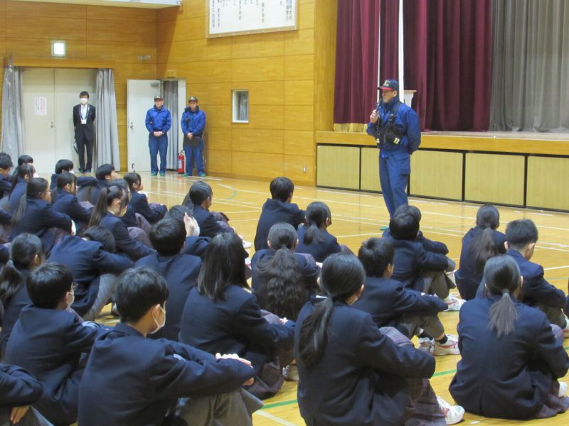 尾道消防署北出張所から3名の署員の方に来ていただき、避難の様子についての講評と消火器の使い方の演習を行っていただきました。当日は雨天のため、グラウンドで実際に消火器を使っての消火訓練はできませんでしたが、使用の際の注意点について丁寧に教えていただきました。今後も避難訓練は行いますが、お互いの命を守るため、真剣に取り組んでいきましょう。